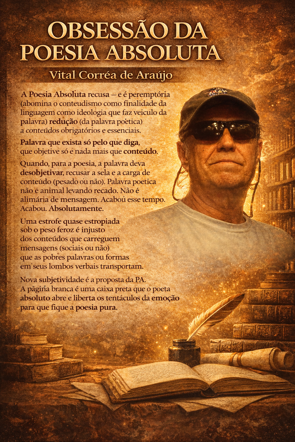 A Poesia Absoluta recusa – e é peremptória (abomina o conteudismo como finalidade da linguagem como ideologia que faz veículo da palavra) redução (da palavra poética) a conteúdos obrigatórios e essenciais. Palavra que exista só pelo que diga, que objetive só e nada mais que conteúdo. Quando, para a poesia, a palavra deva desobjetivar, recusar a sela e a carga de conteúdo (pesado ou não). Palavra poética não é animal levando recado. Não é alimária de mensagem. Acabou esse tempo. Acabou. Absolutamente.